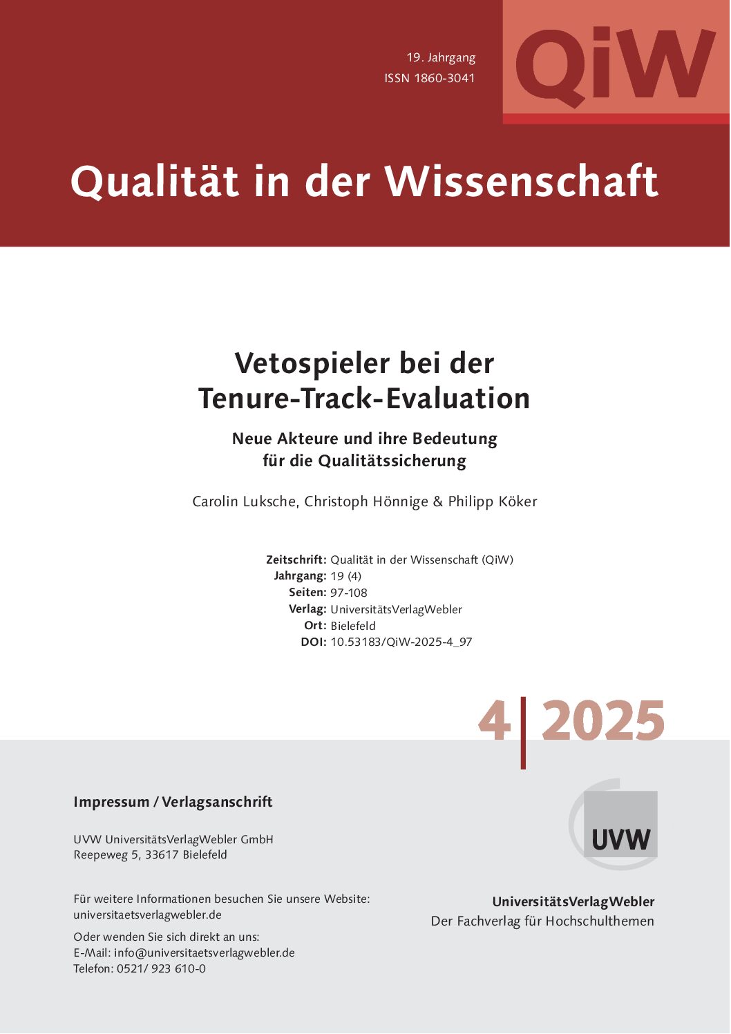Tenure track professorships have become commonplace at many German universities in recent years. This changes the mechanisms of quality assurance in academic staff selection as evaluating academic achievements before granting tenure requires the participation of new actors and committees, such as tenure committees/boards and external reviewers, and the definition of tenure criteria. Using the ‘veto player’ approach that is widely used in political science, we reconstruct the decision-making process of final tenure evaluations at 84 German universities. Our analysis assesses the extent to which different actor constellations and procedures for setting tenure criteria contribute to a greater quality in tenure track appointment procedures.
