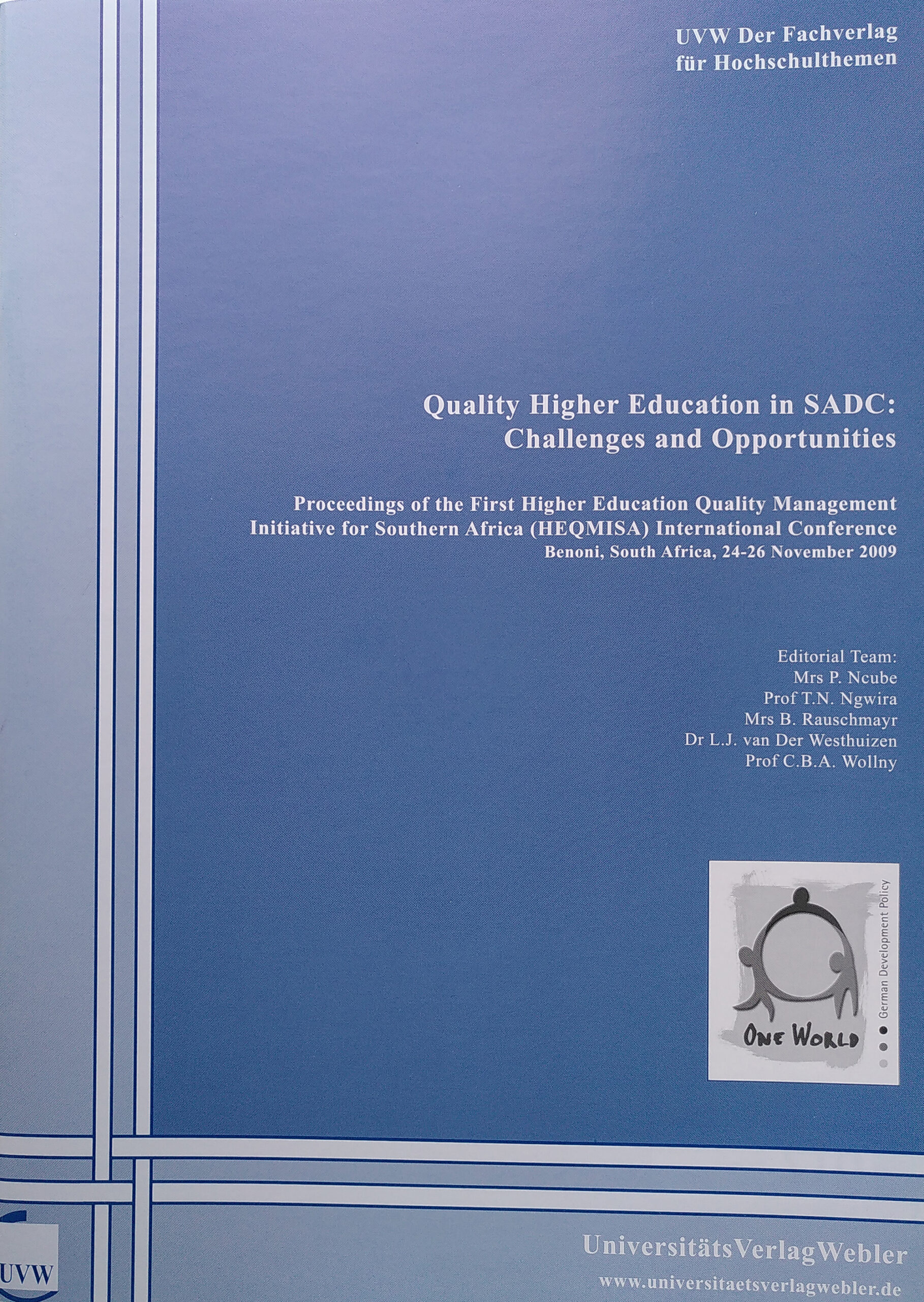 The first Higher Education Quality Management Initiative for Southern Africa (HEQMISA) Internation Conference was held in Benoni, South Africa, from 24 to 26 November 2009, and hosted various international experts as keynote speakers. The conference on Quality Higher Education in SADC: Challenges and Opportunities, aimed at redefining quality in higher education in the SADC region, where various national and international environments combine with a diversity of institutions and create a need for innovative quality improvement and quality assurance systems. A central goal of the conference was to expand the boundaries of quality frameworks to encompass all aspects of teaching and learning, research and community engagement, adademic development services and support services. Recognizing the importance of quality higher education for development of SADC, the conference discussed ways of meeting the needs of higher education in the region by sharing best practices and expertise. Therefore senior academics and educational stakeholders in the SADC region were brought together to encourage greater collaboration, enhance quality involvement, foster networking, and share strategic practices and visions.
